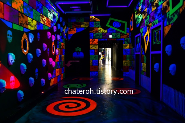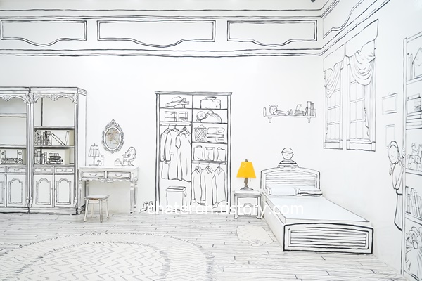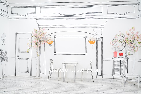 그리고 제가 가장 좋아했던 곳은 이 공간이에요. 그동안 위에서 보았던 것은 8 ~ 9년 전에 왔을 때도 있던 것들이 대부분이었는데 이게 새로 생겼더라구요? 온통 하얀색으로 된 공간에 검정색으로 그림이 그려져있고 몇가지는 진짜 소품이기도 해요.