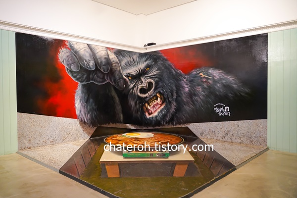 킹콩인지 고릴라인지 저 손가락에 옷을 걸 수 있는 걸이가 있어서 거기에 옷을 걸면 맹수의 손에 달랑달랑 매달린 사진을 찍을 수 있어요. 킹콩이 떡볶이 안에 사람을 넣으려는 재밌는 모습이 나온답니다.