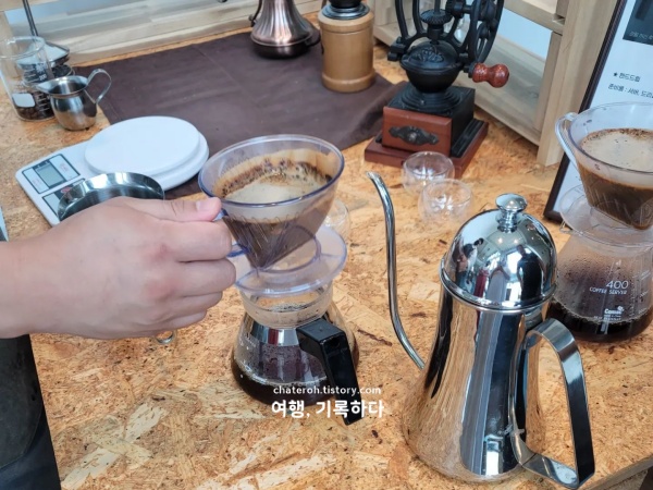 카페만 있는 게 아니라 체험 프로그램도 다양하게 운영되고 있었어요. 모카포트 체험을 통해 직접 커피를 내리는 즐거움을 느낄 수 있었고, 기계 커피와 비교해보는 시간은 아이는 물론 어른에게도 흥미로운 경험이었어요. 2층에 마련된 좌석에서 빗소리를 들으며 창밖을 바라보니 잠시 시간이 멈춘 듯한 기분이 들었고, 인파 없이 조용하게 머물 수 있어서 더 좋았습니다.