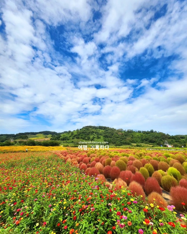 꽃밭은 그야말로 다채로운 향연이에요. 코스모스, 백일홍, 천일홍, 촛불맨드라미, 메밀꽃, 핑크뮬리까지... 가을 정취를 꽉 채운 테마 꽃길이 이어져 있어 사진 찍는 족족 작품이 됩니다. 시그니처 포인트는 언덕 위 붉은 코키아 군락지로, 해질 무렵 금빛 햇살과 맞물리면 영화 속 장면처럼 몽환적인 분위기가 펼쳐집니다. 아이들과 함께하는 가족 여행, 추석 연휴 연인과의 근교 나들이 코스로도 손색없고 주말은 다소 붐비지만 아침 일찍 방문하면 여유롭고 낭만적인 산책을 즐길 수 있는 가을 서울근교 가볼만한곳 베스트 10입니다.