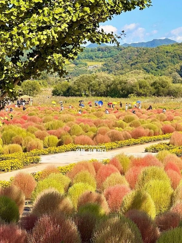 임진강을 따라 조성된 공원은 매년 가을이면 알록달록 댑싸리(코키아)가 물결치듯 피어나는 풍경으로 가득합니다. 9월 중순부터 10월 중순까지 절정을 이루며, 초록에서 분홍, 빨강으로 그라데이션되는 색감이 가을 감성을 제대로 자극해요. 입장료는 없고 주차도 무료라 부담 없이 들를 수 있는 서울 근교 여행지죠. 산책로도 정비가 잘 되어 있어 유모차 끌고 오는 가족들도 많고요. 돌무지 무덤, 조형물, 평상 포토존이 곳곳에 있어 사진 찍기 좋은 명소입니다.