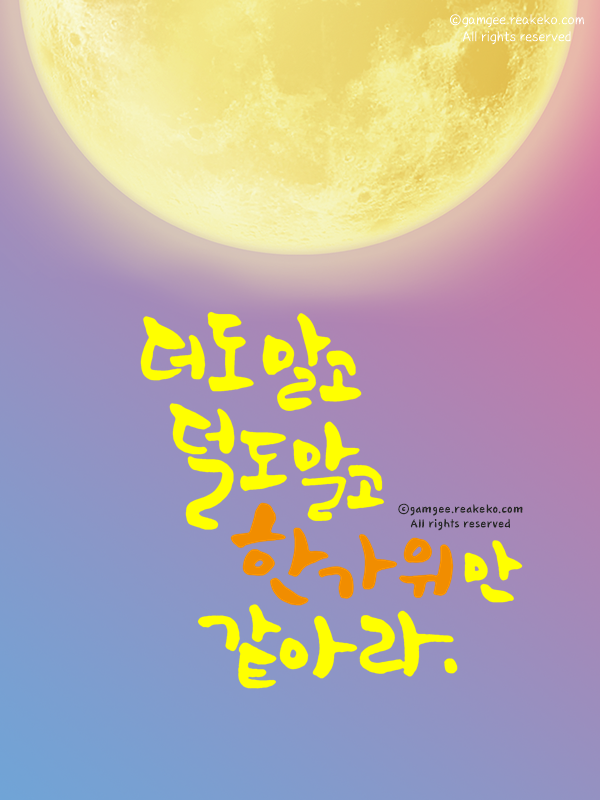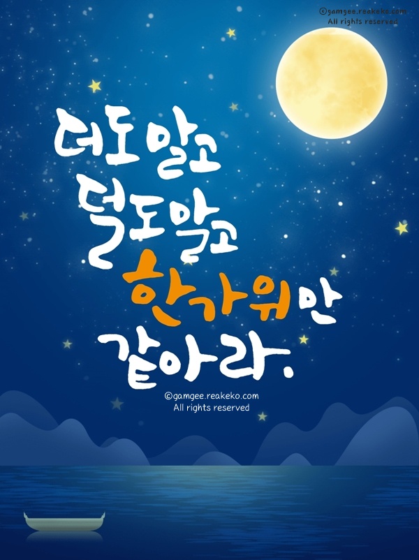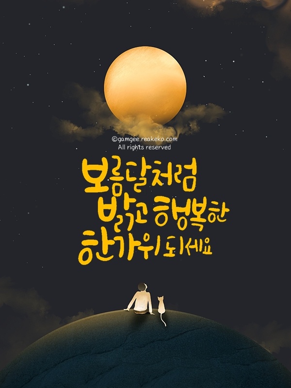 언제 더웠나 싶을 정도로 선선한 바람이 불어오는 계절 가을입니다. 민족 대명절 한가위를 맞이하여 휘영청 밝게 떠오른 둥근 보름달에 소원도 빌어보세요. 보름달의 밝은 빛이 늘 당신 곁에 함께 했으면 좋겠습니다. 댁내 늘 좋은 일과 건강이 넘쳐나기를 기원하며 한가위 보름달처럼 둥글고 넉넉한 추석연휴 보내십시오.