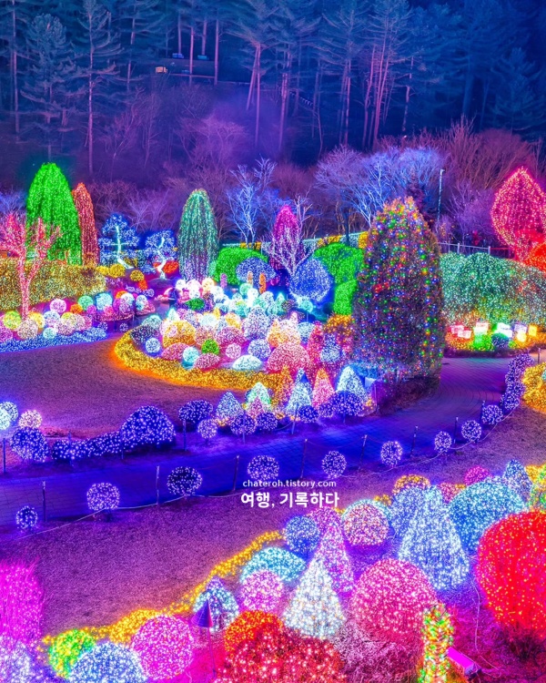 빛 터널, 연못 주변, 언덕 전망 포인트, 하트 조형물 아래… 걸음을 옮길 때마다 다른 색, 다른 온도, 다른 분위기가 이어졌고, 그 순간마다 겨울밤이 얼마나 다채로울 수 있는지 알게 되었다. 산자락이라 체감 온도가 서울보다 낮고, 걷는 거리가 꽤 되는 편이니 두꺼운 외투, 겨울용 단단한 신발, 핫팩은 꼭 챙기는 게 좋다. LED 조명이 만들어내는 따뜻하면서도 겨울다운 공기 속에서, 가평의 겨울은 ‘얼음처럼 차갑지만 촉촉하게’ 다가오는 겨울 서울근교 1박 2일 여행지다.