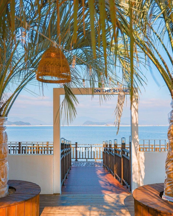 거제도에서 가장 유명한 오션뷰 카페를 꼽으라면 이 곳을 빼기 어렵다. 성포 해안가에 4층 규모로 자리 잡은 온더선셋은 라탄 소품과 야자수로 꾸며진 공간 덕분에 동남아 어딘가에 온 것 같은 착각이 든다. 각 층마다 통유리를 통해 바다가 보이고, 두 건물을 연결하는 선셋브리지는 사진을 찍으러 일부러 찾아오는 사람들이 있을 만큼 뷰 맛집으로 소문났다. 시그니처인 선셋커피(9,000원)와 거제 유자 에이드(8,500원)는 여기서만 마실 수 있는 맛이다.