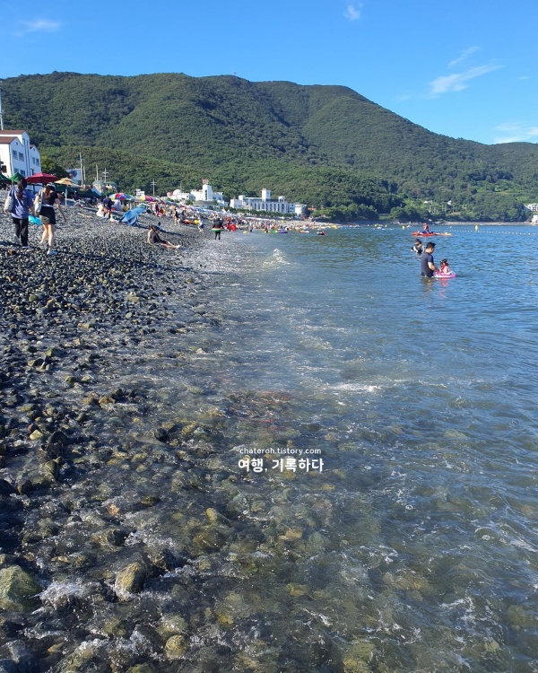모래 해변인 줄 알고 갔다가 검은 몽돌에 당황하는 사람들이 적지 않다. 그런데 막상 해변에 서서 파도가 몽돌을 굴리는 소리를 들으면, 재그락재그락 굴러가는 돌과 파도가 만드는 리듬이 중독적이어서 한참을 그냥 서 있게 된다. 이 소리는 어디서도 들을 수 없는 거제만의 것이다. 해변 길이만 1.2km에 달하고 수심이 깊지 않아 물놀이를 즐기기에도 나쁘지 않다.