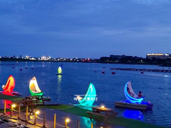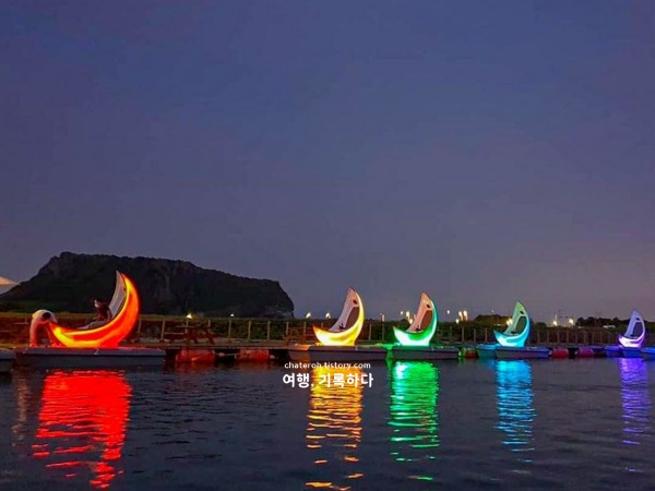 달을 타고 바다 위를 떠다니는 듯한 경험, 문보트는 그 자체로 특별한 서귀포 밤에 가볼만한곳이었습니다. 오조리 레저파크에서 운영하는 보트는 서서히 어둠이 내려앉을수록 바다 위에서 바라보는 성산 일출봉과 서귀포의 야경이 너무도 아름다웠습니다. 둥글게 빛나는 보트는 여러 색으로 변하며 물 위를 부드럽게 미끄러져, 마치 작은 우주선을 타고 여행하는 기분이 들었어요.
