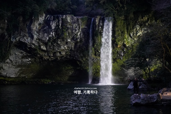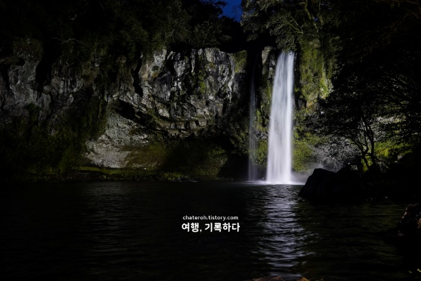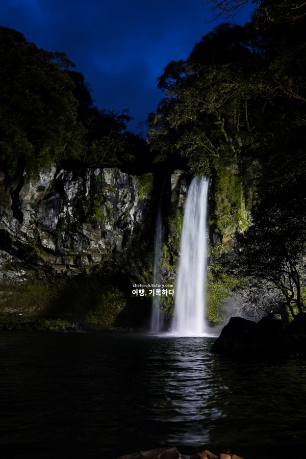 22m 높이에서 쏟아지는 폭포수는 공중에 부드러운 물안개를 흩뿌리며, 밤에는 조명 덕분에 더욱 환상적인 모습을 보여줍니다. 폭포 아래 넓게 자리 잡은 연못은 잔잔하게 흔들리면서 빛을 머금은 채 고요한 풍경을 만들어내요. 계단 없이 평탄한 길이라 남녀노소 누구나 부담 없이 걸을 수 있고, 곳곳에 마련된 조명이 이곳이 왜 제주에서 가장 아름다운 야경 명소로 꼽히는지 자연스레 실감할 수 있을 거예요.