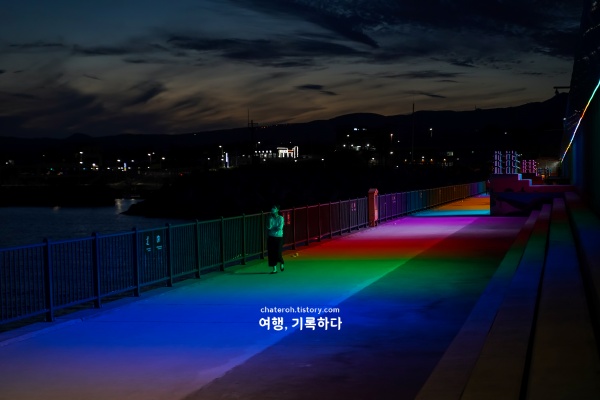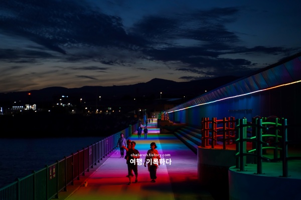 산책로를 따라 걸으면 발밑으로 바닷바람이 부드럽게 스치고, 파도 소리가 귓가에 잔잔하게 울립니다. 밤바다는 한낮의 활기와는 또 다른 평온함이 있어, 가만히 걷기만 해도 마음이 차분해지는 기분이 들었어요.
