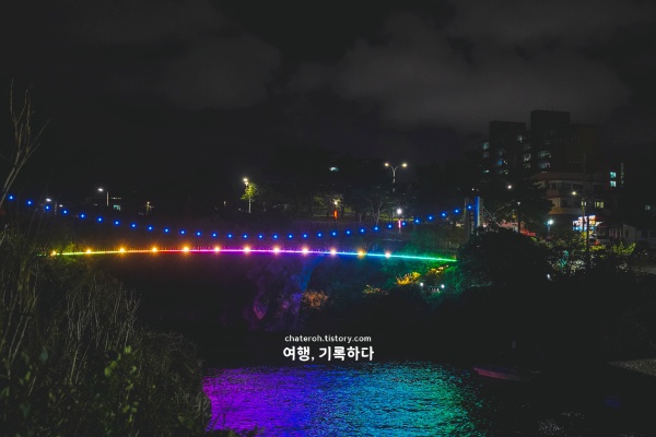 바닷바람이 부드럽게 스치는 용연구름다리는 제주의 풍경을 한눈에 담을 수 있는 제주도 밤에 가볼만한곳입니다. 길이 127m, 높이 약 20m의 이 다리는 용연 계곡 위에 놓여 있어, 마치 공중을 걷는 듯한 짜릿한 기분이고 다리 중간에 서서 아래를 내려다보면, 에메랄드빛 물길이 끝없이 이어집니다.